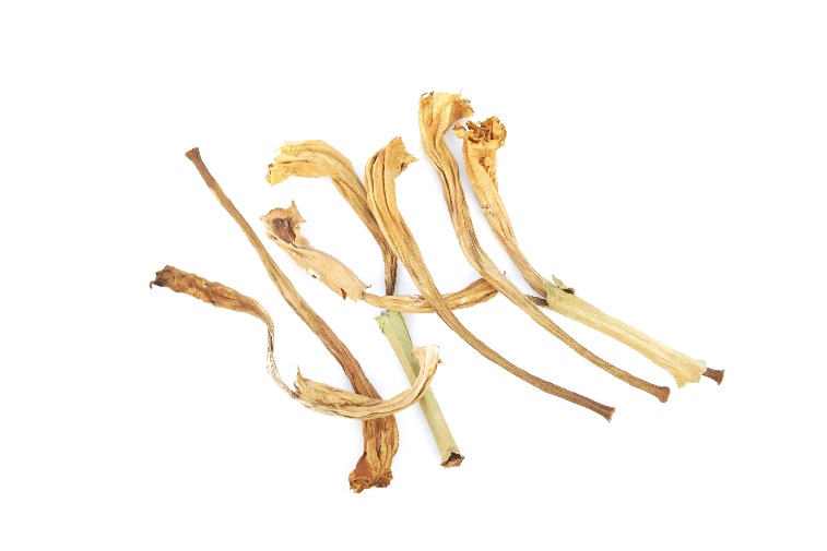 洋金花药材常皱缩成条状,花萼成筒状,花冠为喇叭状;凌霄花皱缩卷曲,花萼硬,花冠内有明显的深棕色脉纹,可用水泡法进一步辨别。